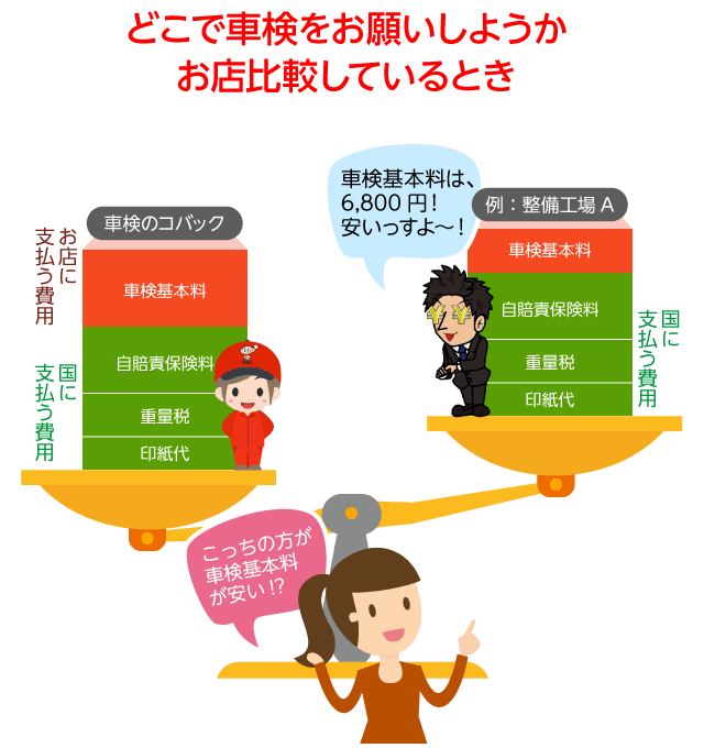 コバック車検に必要な費用は、「車検基本料」と「国に支払う費用(自賠責保険料・重量税・印紙代)」だけです。