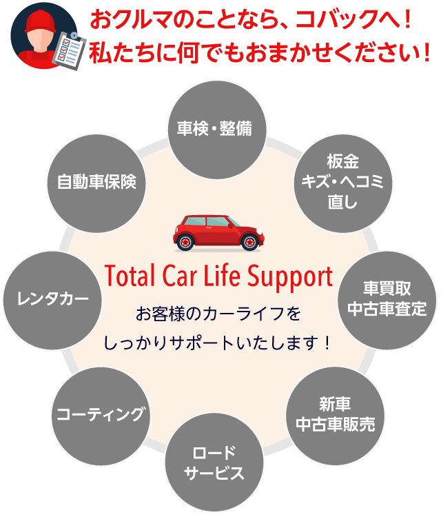ご安心ください!フラット7 岡山西市ではお車のご購入はもちろん、自動車保険から点検、メンテナンス、車検、事故修理までお車に関することならすべておまかせいただけます。
